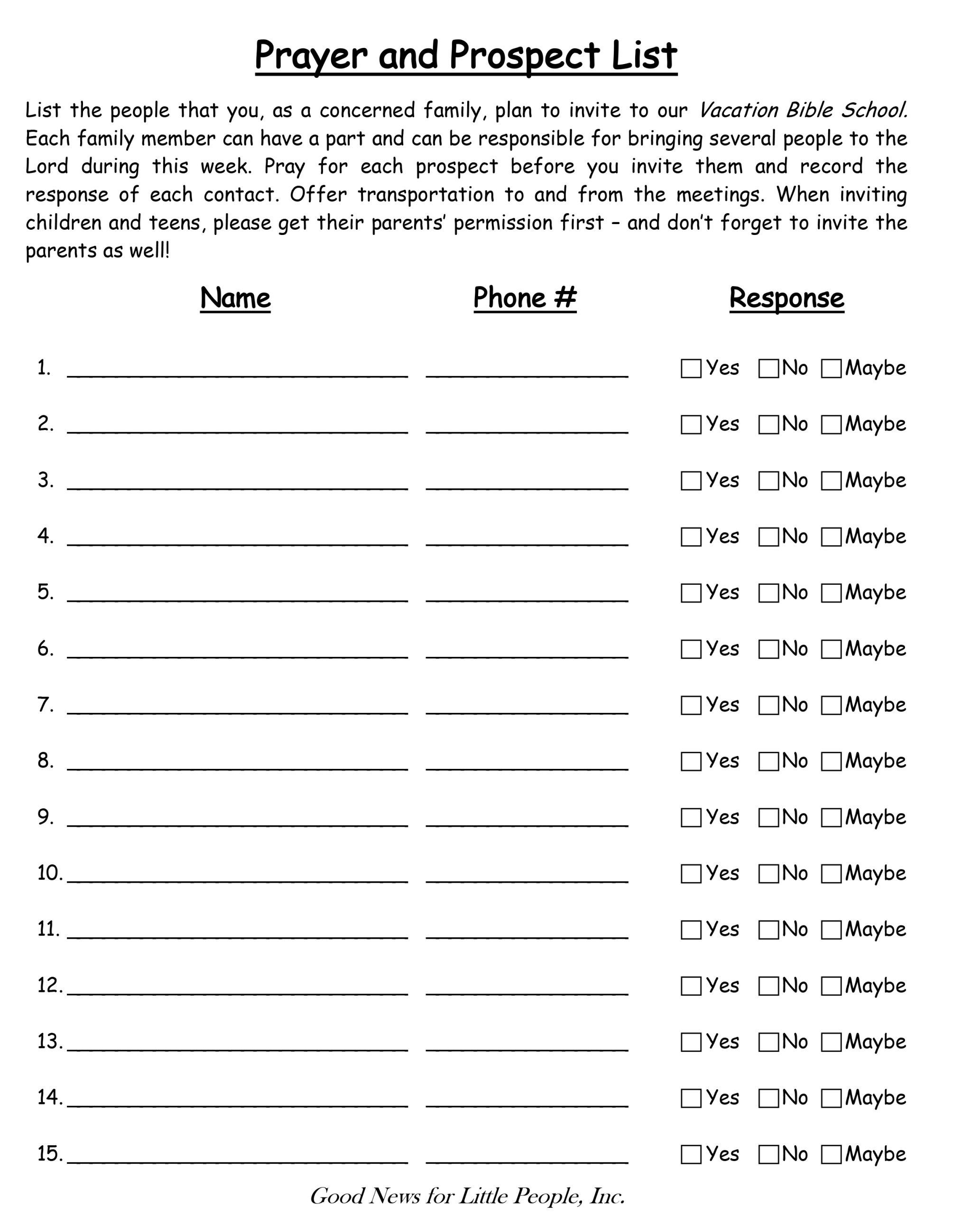 Encourage your people to bring their completed Prayer and Prospect Lists to church on the Sunday morning of Vacation Bible School – June 21st. During the invitation time, they can bring their list to the altar for a special time of prayer.
