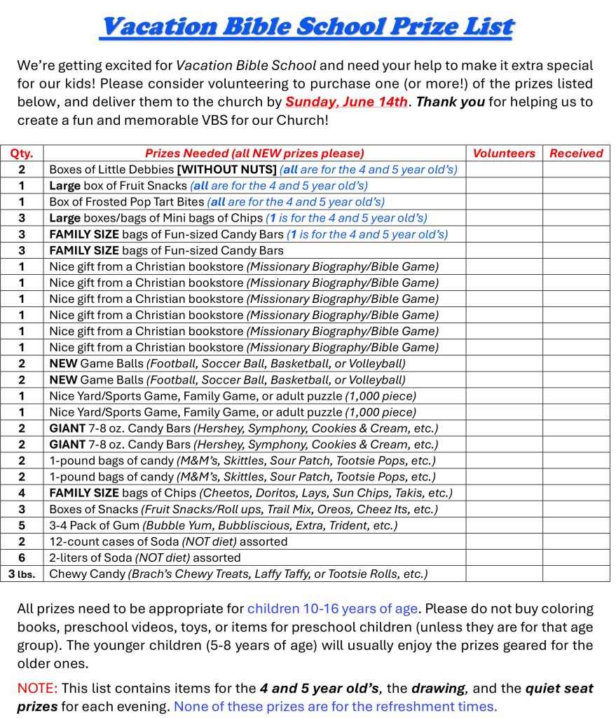 Include Church members, shut-in’s, missionaries, and others who are willing to commit to pray for our upcoming Vacation Bible School.