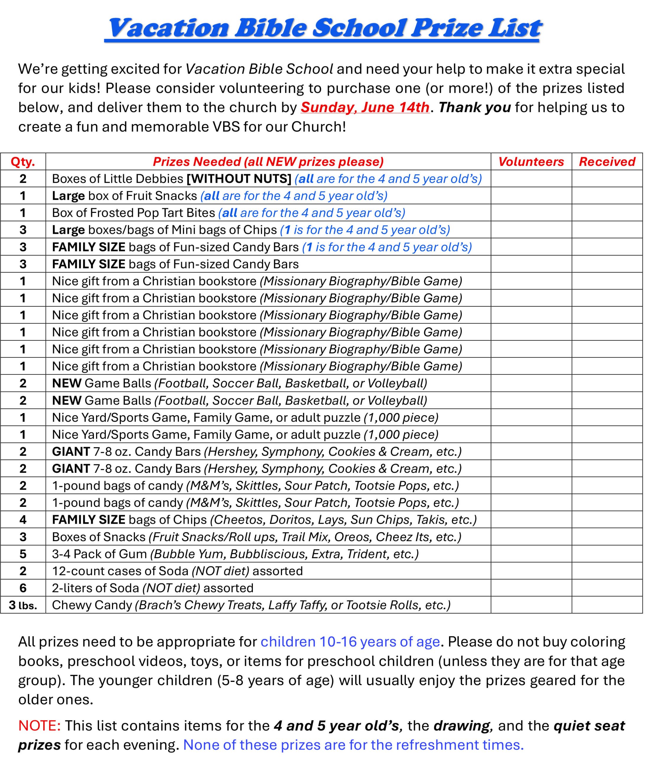 Post this list in a prominent location within your church, so people may sign up to purchase prizes.