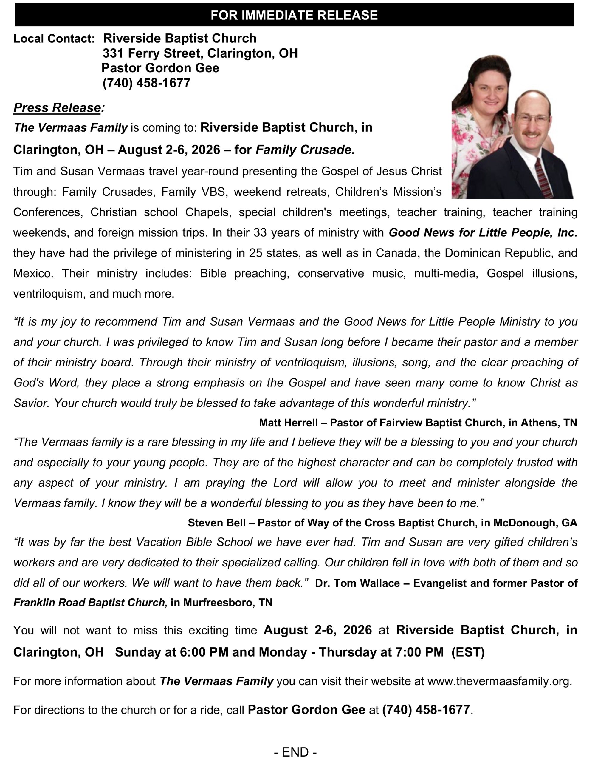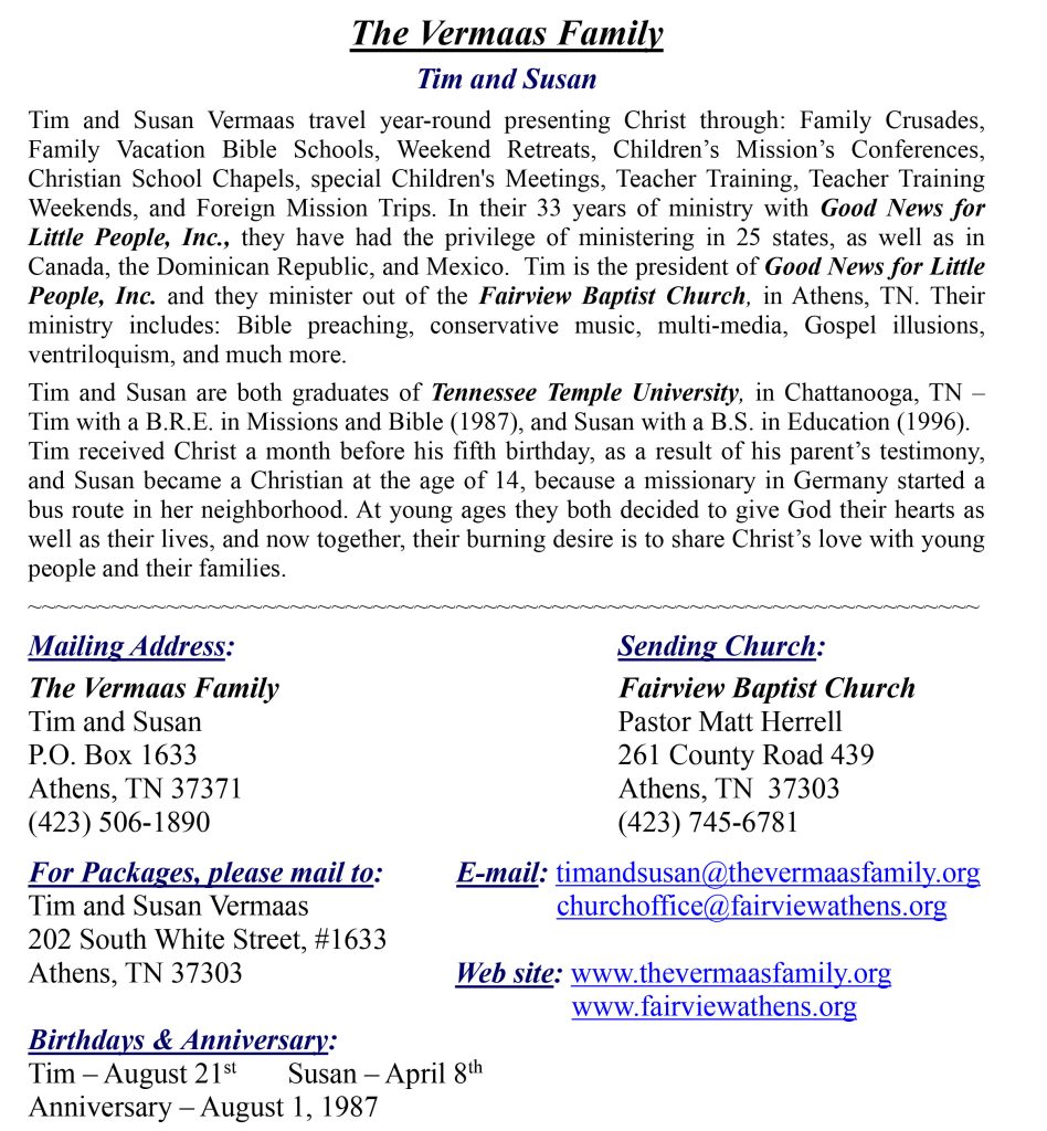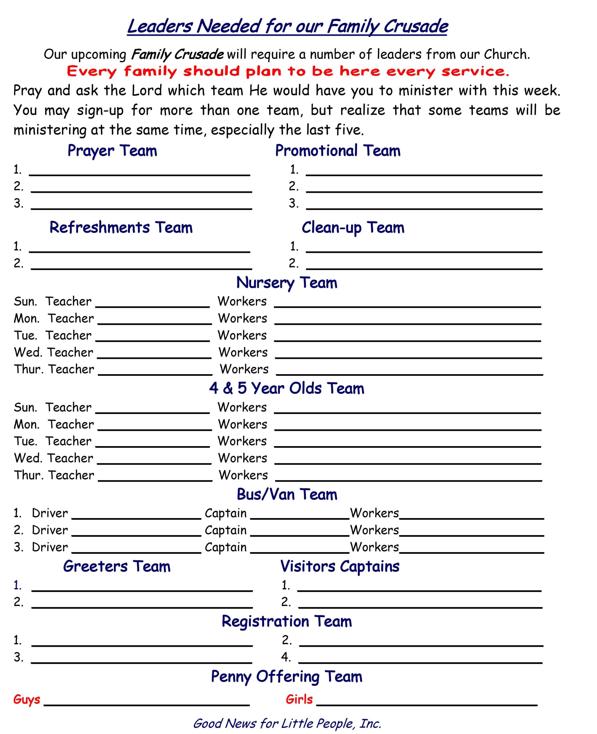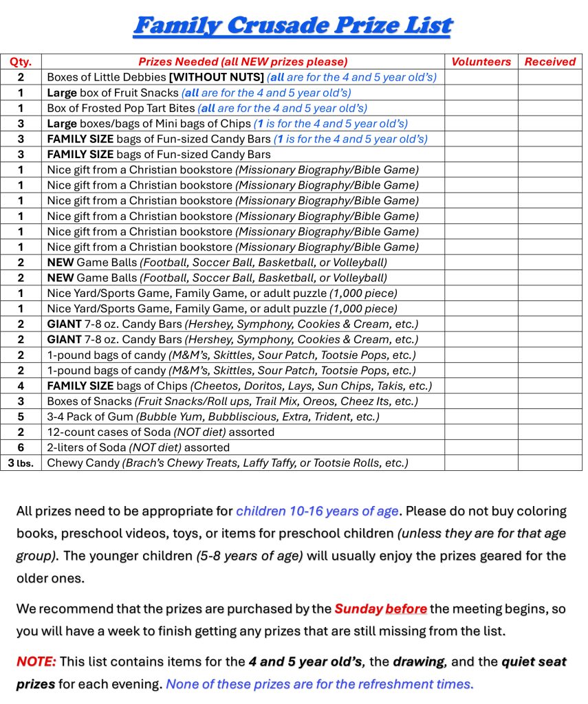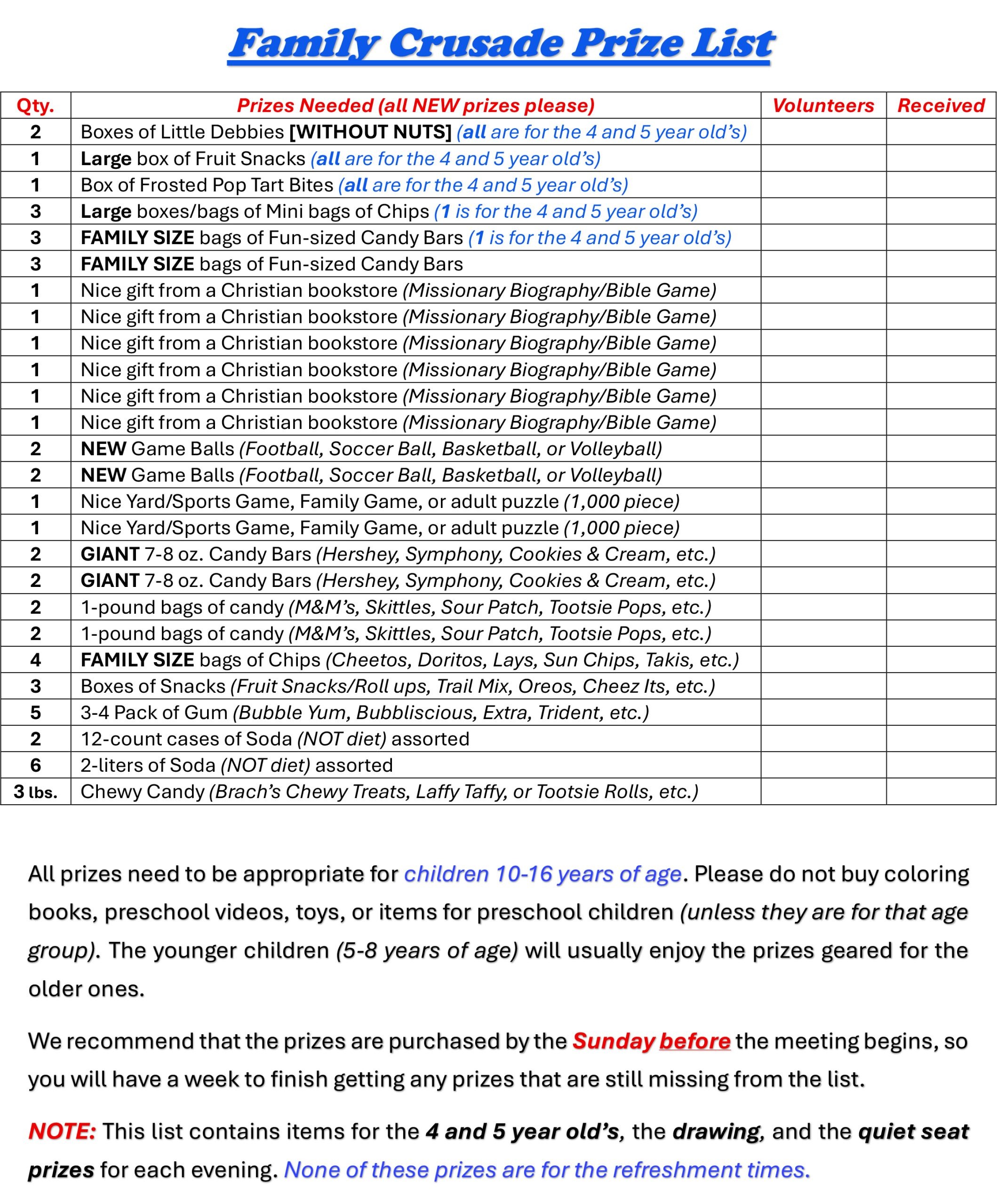 All of the forms and worker instructions listed below should be printed for our upcoming Family Crusade. Click on each image to open it; from there you may either print directly or save the file to your computer and print at your convenience.